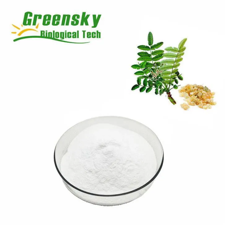 Green Sky Biological--One of the award-winning Chinese Boswellia tree extract manufacturers in the world, supplying 100% natural Boswellia tree extract to different food and pharmaceutical industries. Boswellia tree extract, rich in flavonoids and specific boswellic acids, has been extensively studied and used to relieve inflammation and pain, especially in the treatment of arthritis.